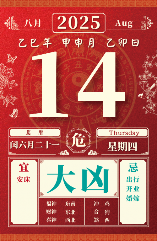 旺运方位:此日利于朝东南方出行;西北方不宜。