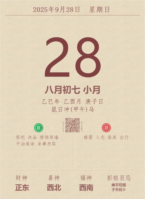 今日老黄历(2025年9月28日):黄历宜忌、财神方位、特吉生肖、打麻将财位
