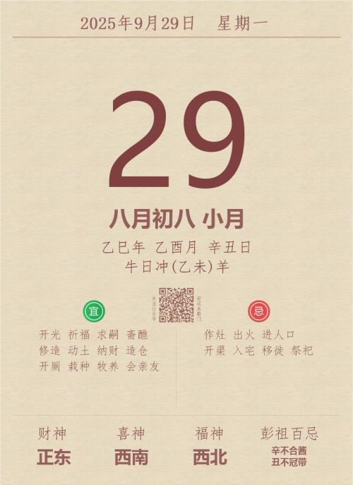 今日老黄历(2025年9月29日):黄历宜忌、财神方位、特吉生肖、打麻将财位
