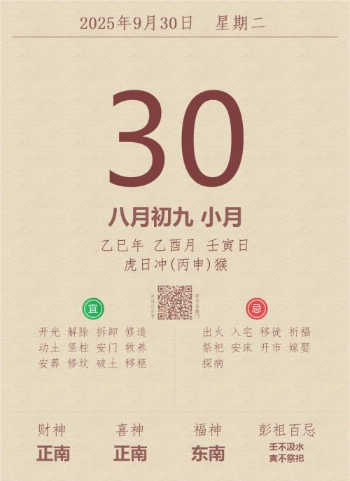 今日老黄历(2025年9月30日):黄历宜忌、财神方位、特吉生肖、打麻将财位
