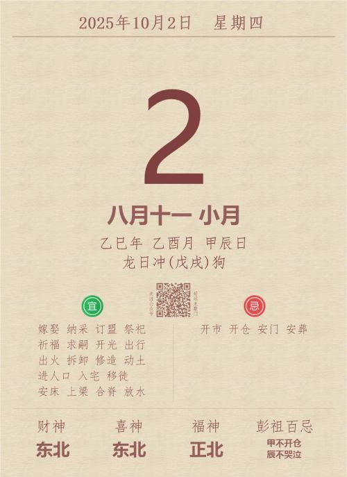 今日老黄历(2025年10月2日):黄历宜忌、财神方位、特吉生肖、打麻将财位