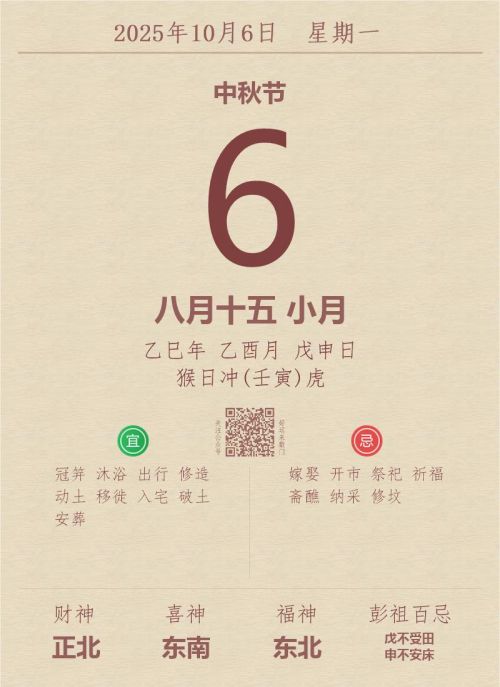 今日老黄历(2025年10月6日):黄历宜忌、财神方位、特吉生肖、打麻将财位