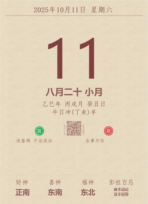 今日老黄历(2025年10月11日):黄历宜忌、财神方位、特吉生肖、打麻将财位
