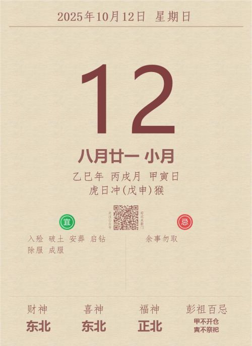 今日老黄历(2025年10月12日):黄历宜忌、财神方位、特吉生肖、打麻将财位