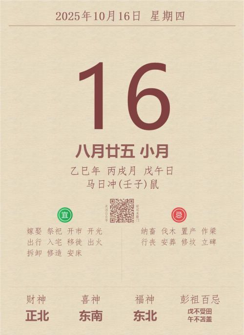 今日老黄历(2025年10月16日):黄历宜忌、财神方位、特吉生肖、打麻将财位