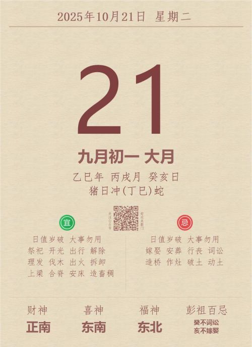 今日老黄历(2025年10月21日):黄历宜忌、财神方位、特吉生肖、打麻将财位