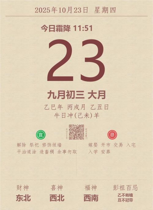 今日老黄历(2025年10月23日):黄历宜忌、财神方位、特吉生肖、打麻将财位