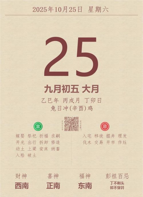 今日老黄历(2025年10月25日):黄历宜忌、财神方位、特吉生肖、打麻将财位