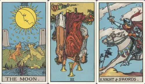 牌:月亮+ 圣杯三- 宝剑骑士+
