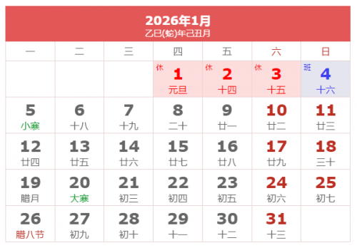 放假:1月1日 ~ 3日(周四 ~ 周六)