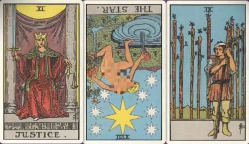 牌:正义+ 星星- 权杖九+