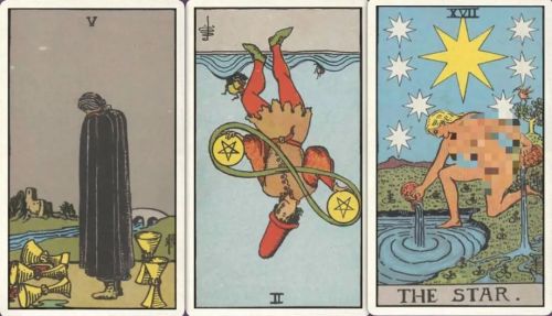 牌:圣杯五+ 星币二- 星星+