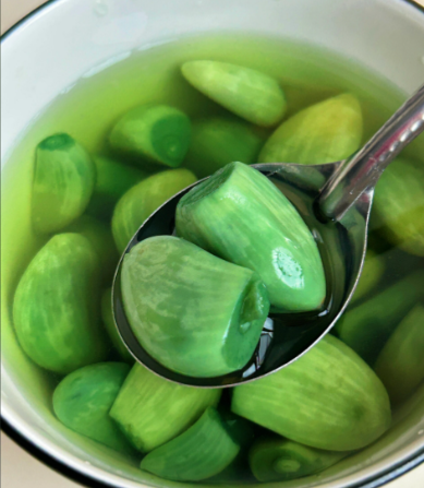蒜:必须用紫皮蒜。它瓣小瓷实,蒜味辛辣浓郁,腌后口感脆爽,是变绿反应的最佳载体。买时挑蒜头紧实、表皮发紫、无发芽霉变的。