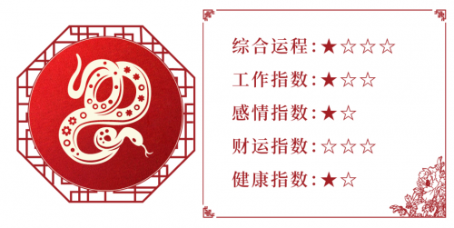 本月运势虽好,但多为表面现象,实则为陷阱,圈套;所以说生肖蛇的朋友,在本月遇事需谨慎,最好不要被眼前利益诱惑,冲昏头脑,不仅耗财,还招惹是非临身,得不偿失。本月最好踏实做事,以稳为主。