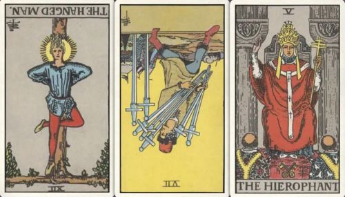 牌:倒吊人- 宝剑七- 教皇+