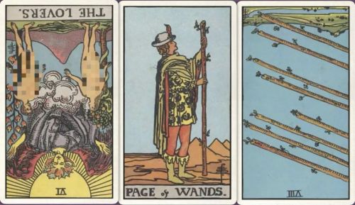 牌:恋人- 权杖侍从+ 权杖八-