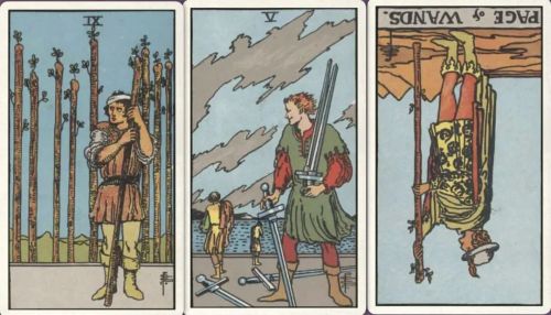 牌:权杖九+ 宝剑五+ 权杖侍从-